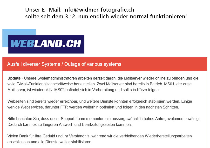 Unser E- Mail sollte seit dem 3.12. nun endlich wieder normal funktionieren! Categories: Allgemein, Fotostudio3. Dezember 2025KommentarnavigationZurückVorheriger Beitrag:Ausfall Mailserver bei WeblandÄhnliche BeiträgeAusfall Mailserver bei Webland26. November 2025Fotoreportage Thurtrans23. August 2025Fotos für Imagebroschüre11. Januar 2025Grosse Gruppen- Fotos7. Oktober 2023Fotoreportage Pumpwerk Sanierung14. Januar 2023Videoclip lebende Fassade5. März 2022